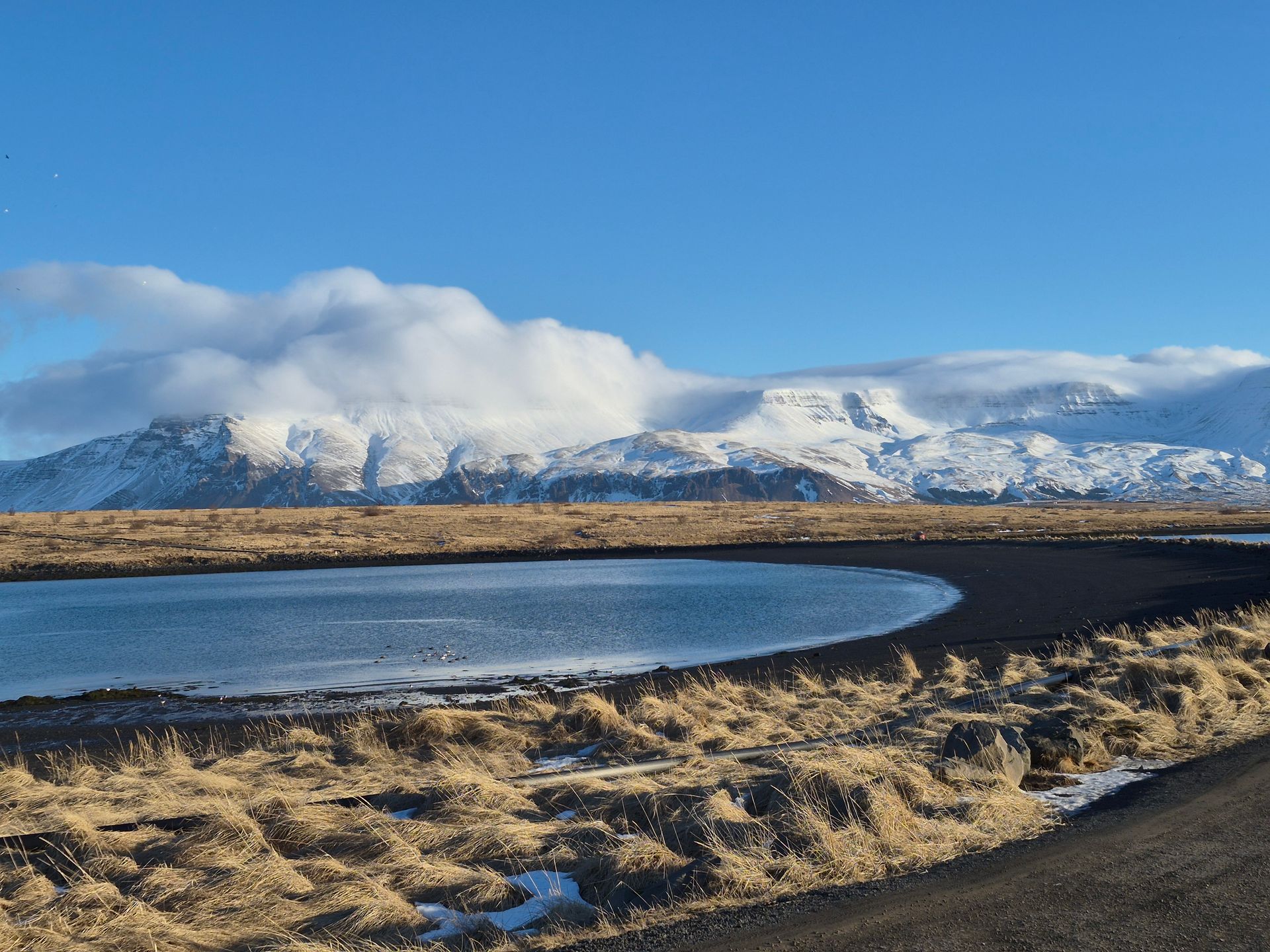 Hún er mögnuð Esjan á mánudagsmorgni - sem aðra morgna. Mjög tilkomumikill kaldur skýjabólstur læddist yfir hana í morgun og faðmaði toppinn að sér. Blár himinninn hafði hlutverk og lét til sín taka sem leiktjald og eins konar „bakrödd“ þessa fallega borgarfjalls. Við skýjaglóparnir hrífumst og myndum magnaða sýn á mánudagsmorgni. - JGH