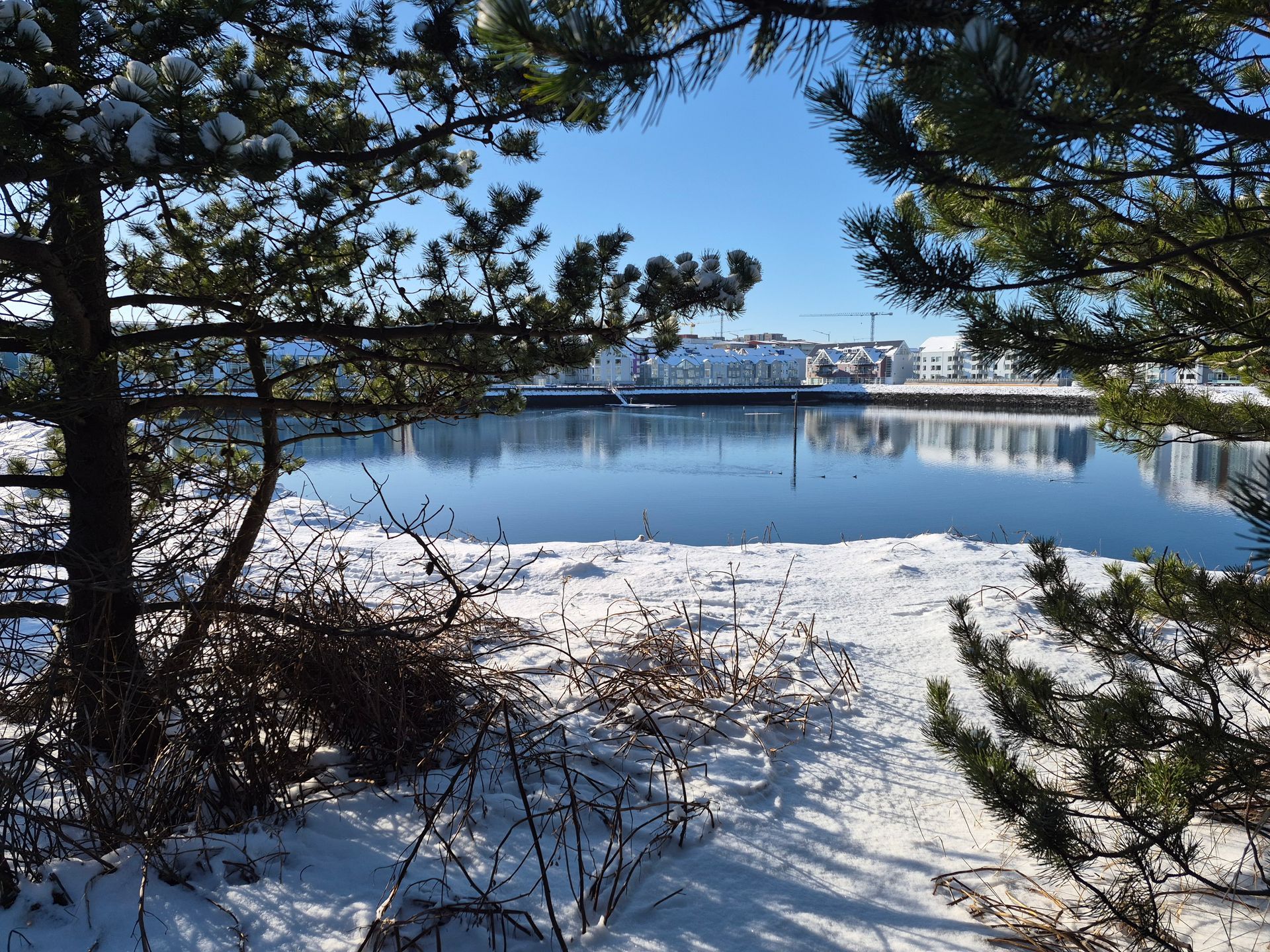 Sígrænt setur svo sannarlega svip sinn á svæðið við göngustíginn í Hamrhverfinu gegnt Bryggjuhverfinu. Það hlýnaði í hádegissólinni og úr varð einn af þessum dýrðardögum að vetri þar sem sléttstraujaður Grafarvogurinn sýndi sínar bestu hliðar hvert sem litið var. Grafarvogsbúar eru svo sannarlega heppnir með sínar mögnuðu gönguleiðir í kringum voginn okkar fallega, svo ekki sé minnst á þegar hann er í glitrandi í sólskinsskapi eins og var í dag. - JGH