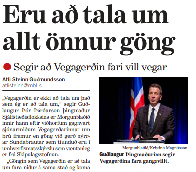 „Vegagerðin er ekki að tala um það sem ég er að tala um,“ segir Guðlaugur Þór Þórðarson þingmaður Sjálfstæðisflokksins í samtali við Morgunblaðið í morgun. En þar er hann inntur eftir viðhorfum gagnvart sjónarmiðum Vegagerðarinnar um brú fremur en göng við gerð nýrrar Sundabrautar sem tíunduð eru í umhverfismatsskýrslu sem væntanleg er frá Skipulagsstofnun.