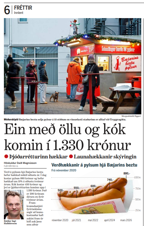 Hin skemmtilega frétt Morgunblaðsins í dag þar sem fylgst er grannt með verðinu á Bæjarins bestu.