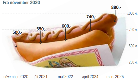 Hún er athyglisverð fréttin í Morgunblaði dagsins þar sem sagði frá verðhækkunum á pylsum hjá Bæjarins bestu frá nóvember 2020 og fylgdi línurit sem sýndi verð á einni með öllu á Bæjarins bestu. Komin Ein með öllu-vísiala á Mogga. Mjög skemmtileg frétt og minnir svolítið á fréttir af Big Mac-vísitölunni hjá tímaritinu The Economist þó ólíku sé saman að jafna.