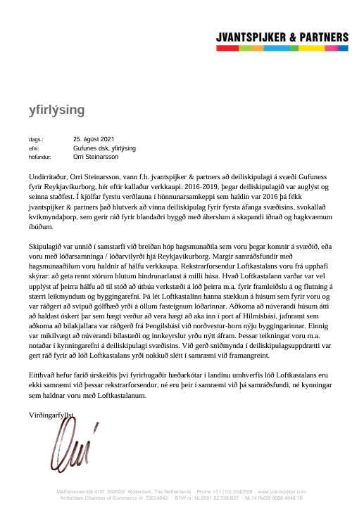 Grafarvogur.net er með undirritað bréf frá Orra frá því 25. ágúst 2021 þar sem fram kemur að hann hafi unnið fyrir hönd fyrirtækisins JVANTSPIJKER & PARTNERS að deiliskipulagi á svæði Gufuness fyrir Reykjavíkurborg þegar deiliskipulagið var auglýst og seinna staðfest. Við birtum hér bréf Orra um málið.