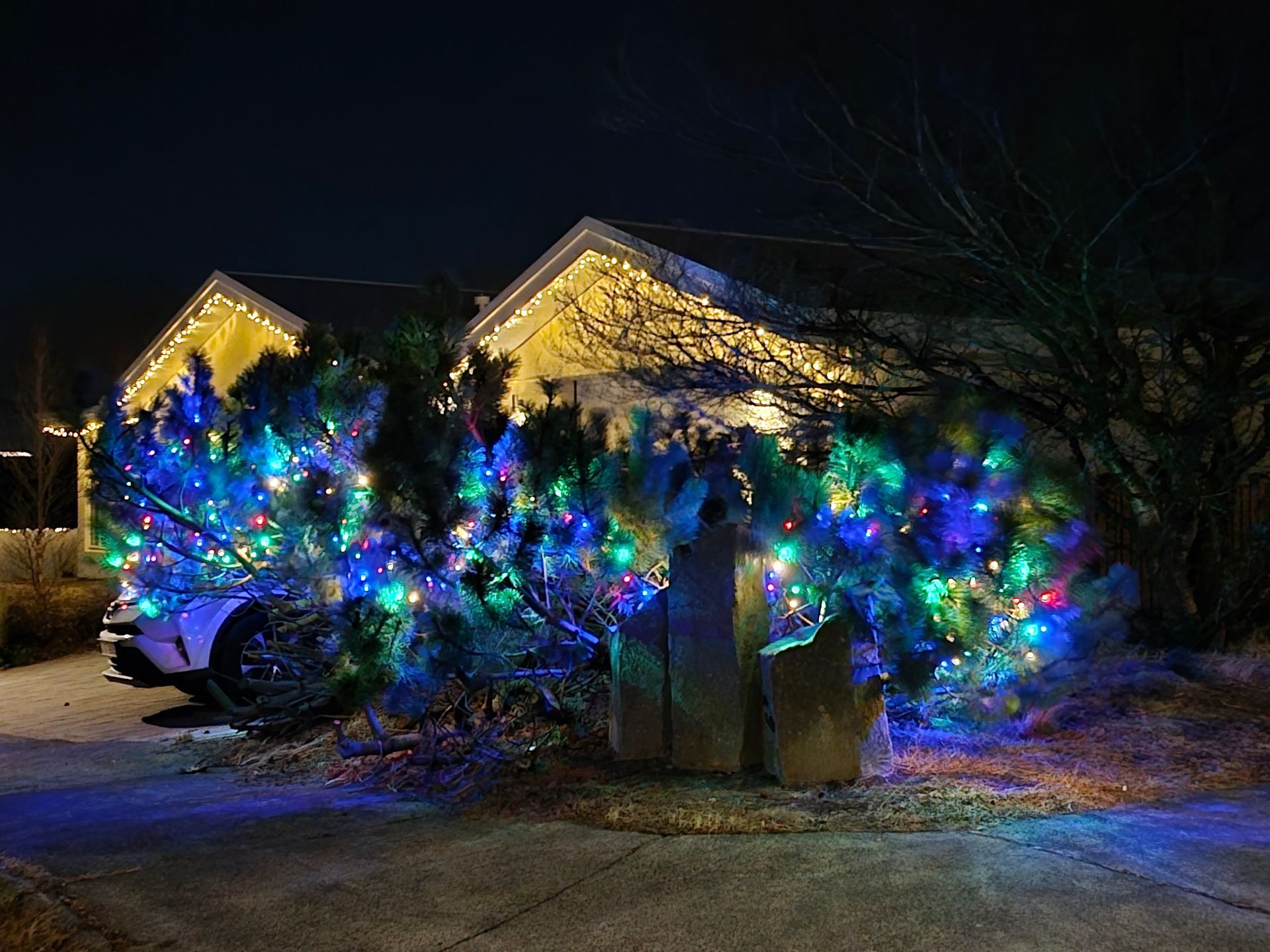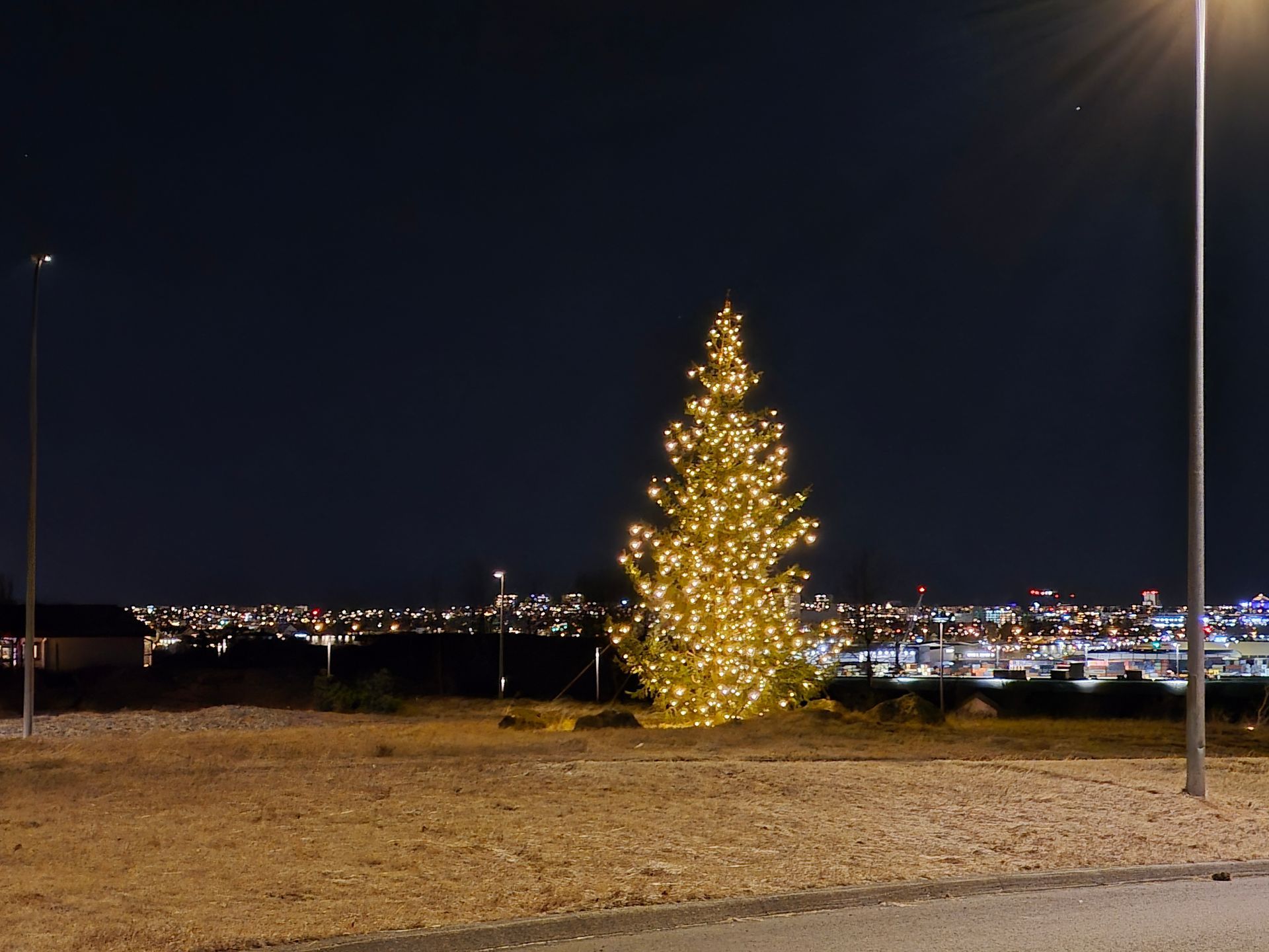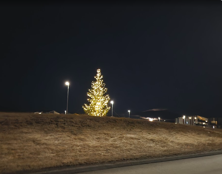 Þetta fallega tré á hæðinni við Borgaveg og Melaveg er sett upp í lok nóvember af Reykjavíkurborg - og skreytingin gerir það að jólatré í hugum flestra. Það skartar sínu fegursta komið fram í febrúar.