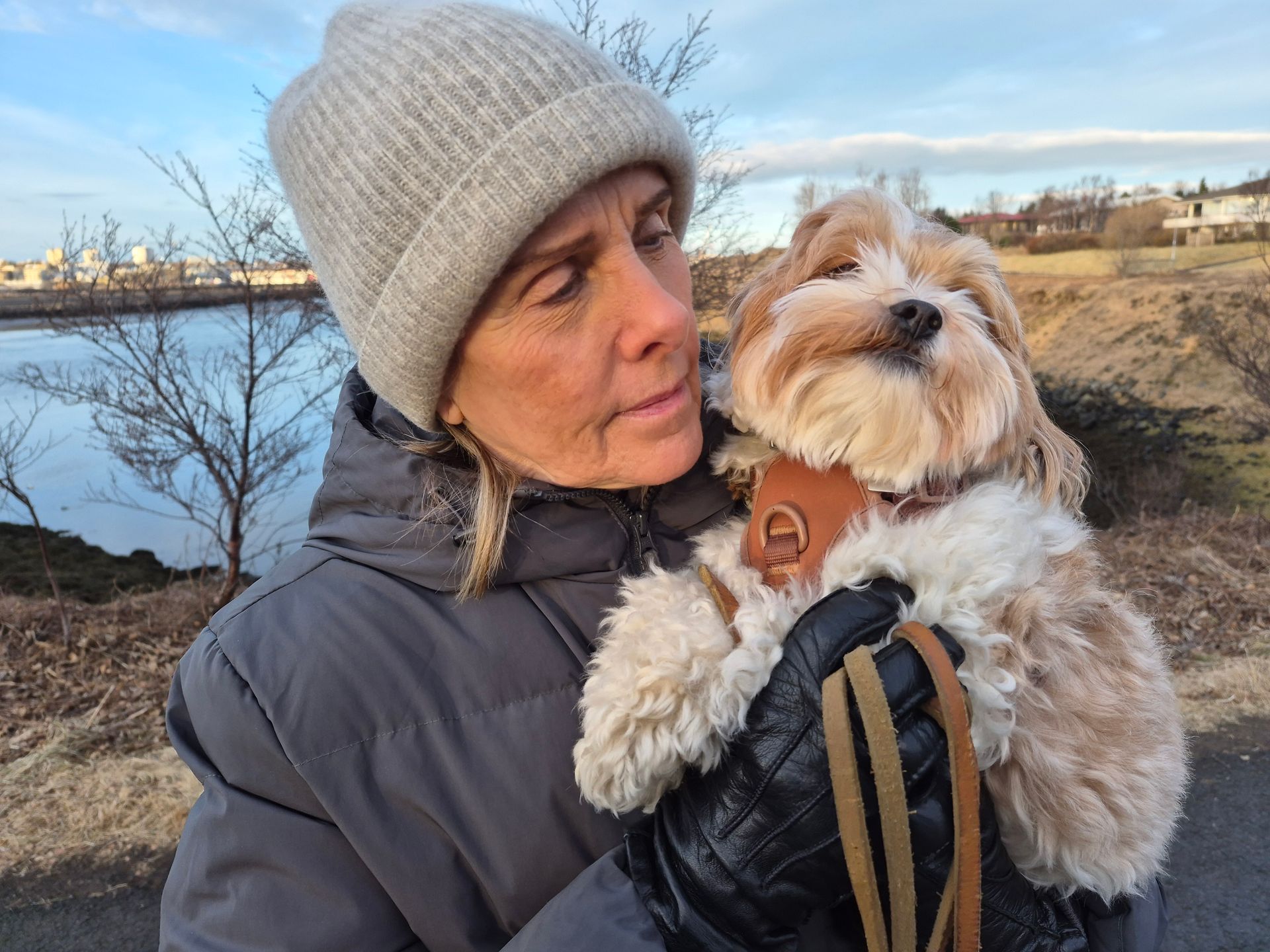 Lína er 2ja ára og sérlega fallegur hundur. Hún er ættuð frá Kúbu, af svonefndu Havanakyni. „Hún er ofboðslega þægileg,“ segir Guðrún. „Ég átti tvo Cavalíer-hunda áður en Lína tekur þeim fram, finnst mér. Hún fer ekki úr hárum sem er algjör lúxus við Havanakynið og þá eru þeir einstaklega barngóðir. Og þótt þeir séu svona litlir eru þeir mjög duglegir og fara í fjallgöngur með eigendum sínum ef því er að skipta. Þeir eru áberandi hraustir og harðir af sér.“