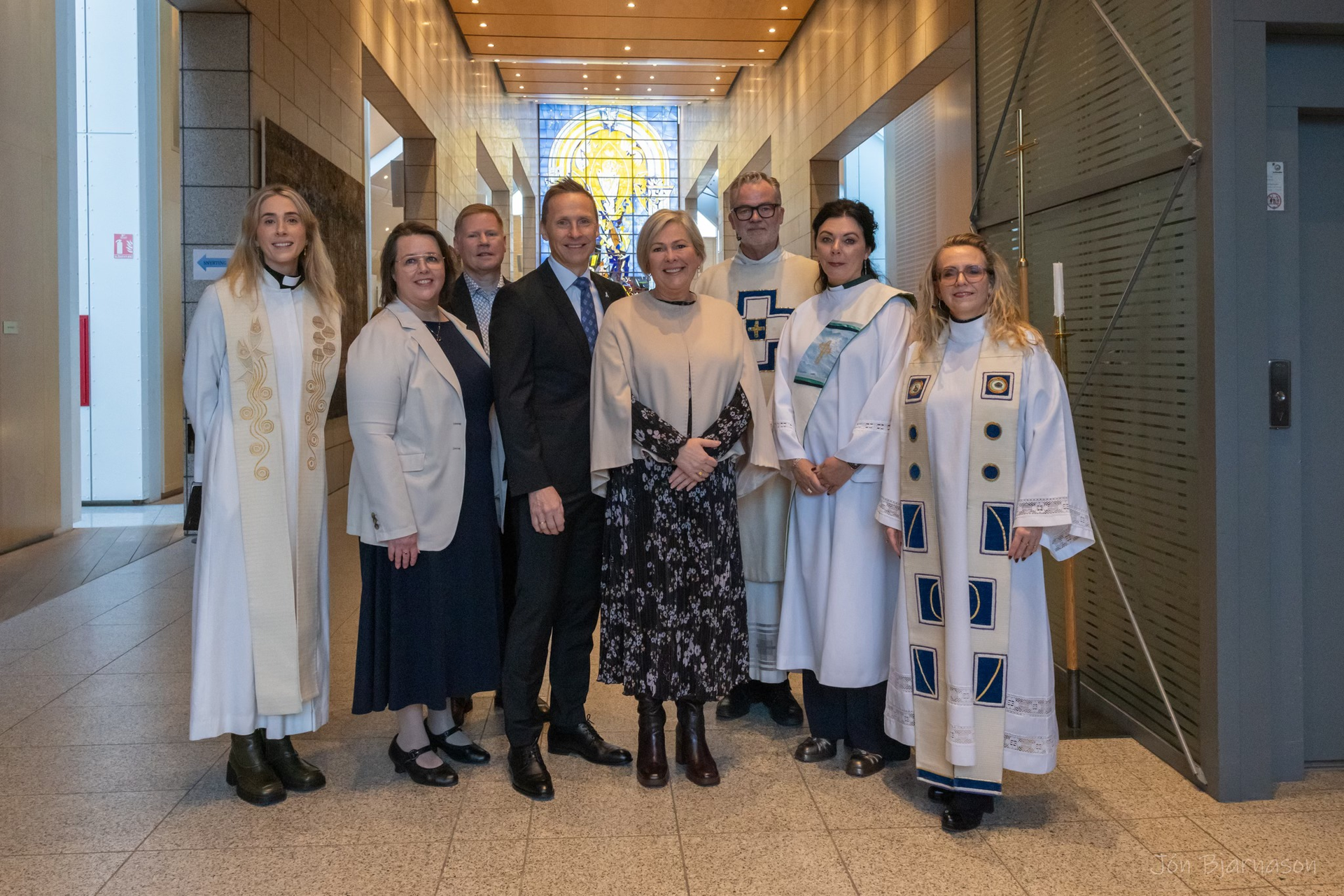 Forsetahjónin voru heiðursgestir í hátíðarguðsþjónustuinni þar sem vígðir þjónar kirkjunnar þjónuðu fyrir altari en prédikunina flutti séra Arna Ýrr Sigurðardóttir sóknarprestur. Frá vinstri séra Aldís Rut Gíslasdóttir, Anna Guðrún Sigurvinsdóttir, formaður sóknarnefndar, Ólafur Sverrisson, ritari sóknarnefndar, forsetahjónin Björn Skúlason og frú Halla Tómasdóttir, séra Sigurður Grétar Helgason, Kristín Kristjánsdóttir djákni og séra Arna Ýrr Sigurðardóttir sóknarprestur.
