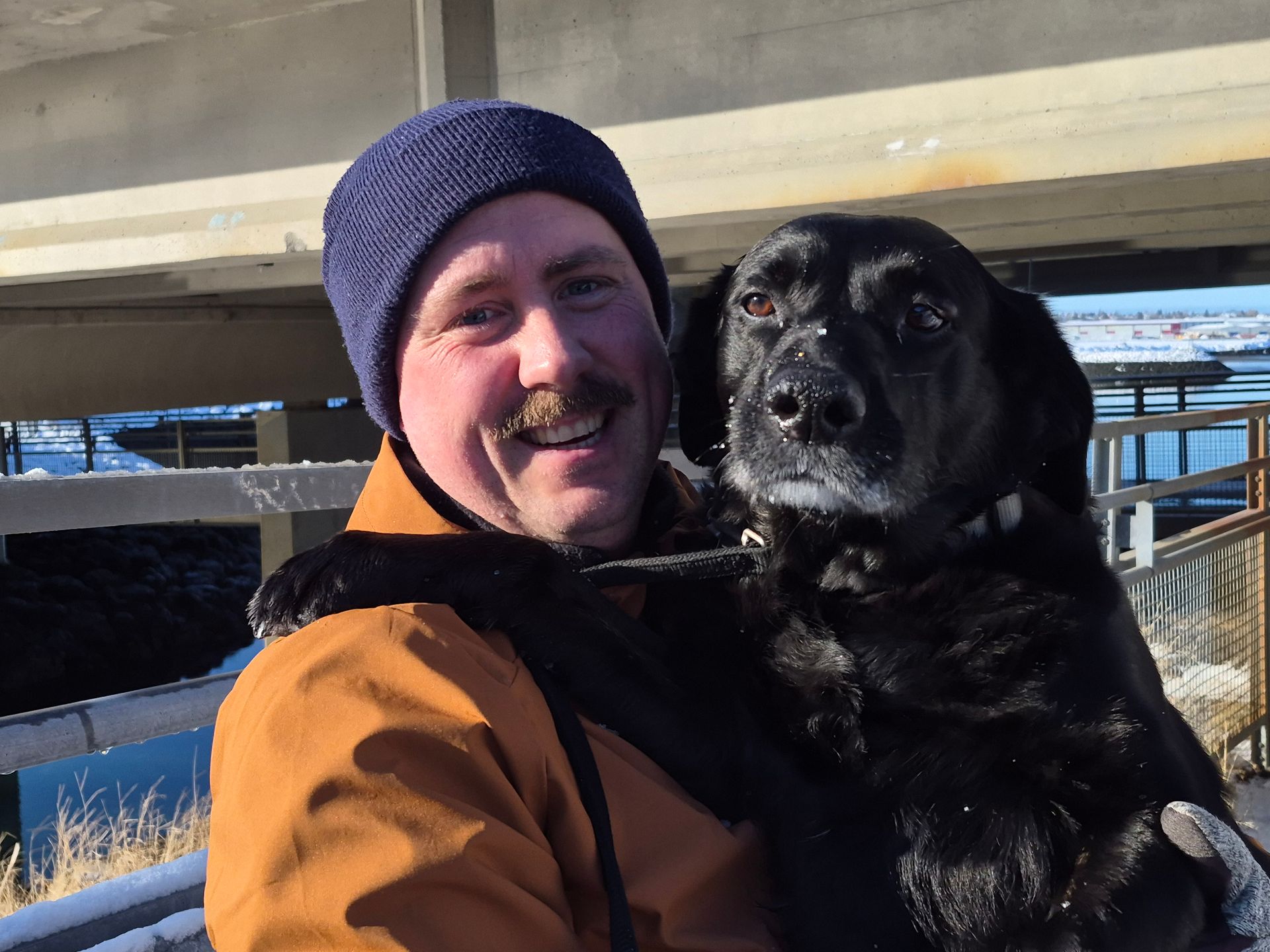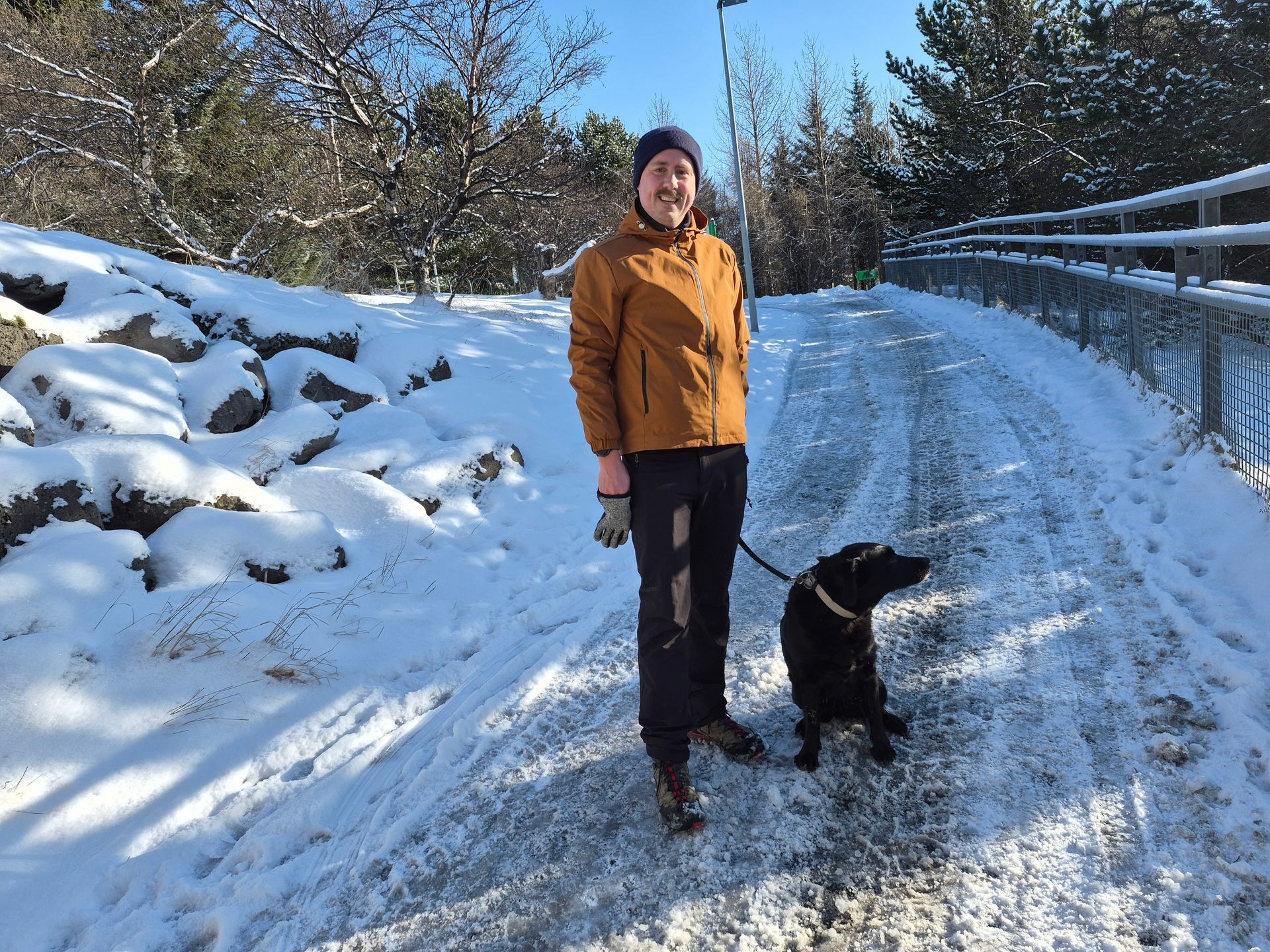 Gunnar Hrafn Arnarson með hana Sölku sem er orðin tólf ára en trítlar en nokkuð léttilega frá Langholtsveginum upp í Logafold.