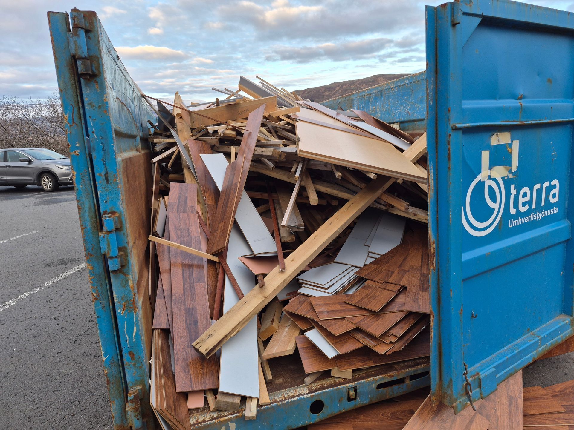Þegar Grafarvogur.net var þarna á ferð í dag vakti stór gámur fyrir utan leikskólann athygli en hann var fullur af parketi, timbri og öðrum innanstokksmunum úr skólanum. Borgin hefur augljóslega ráðist í töluverða vinnu til að rífa innan úr húsunum til að fjarlægja mygluna.
