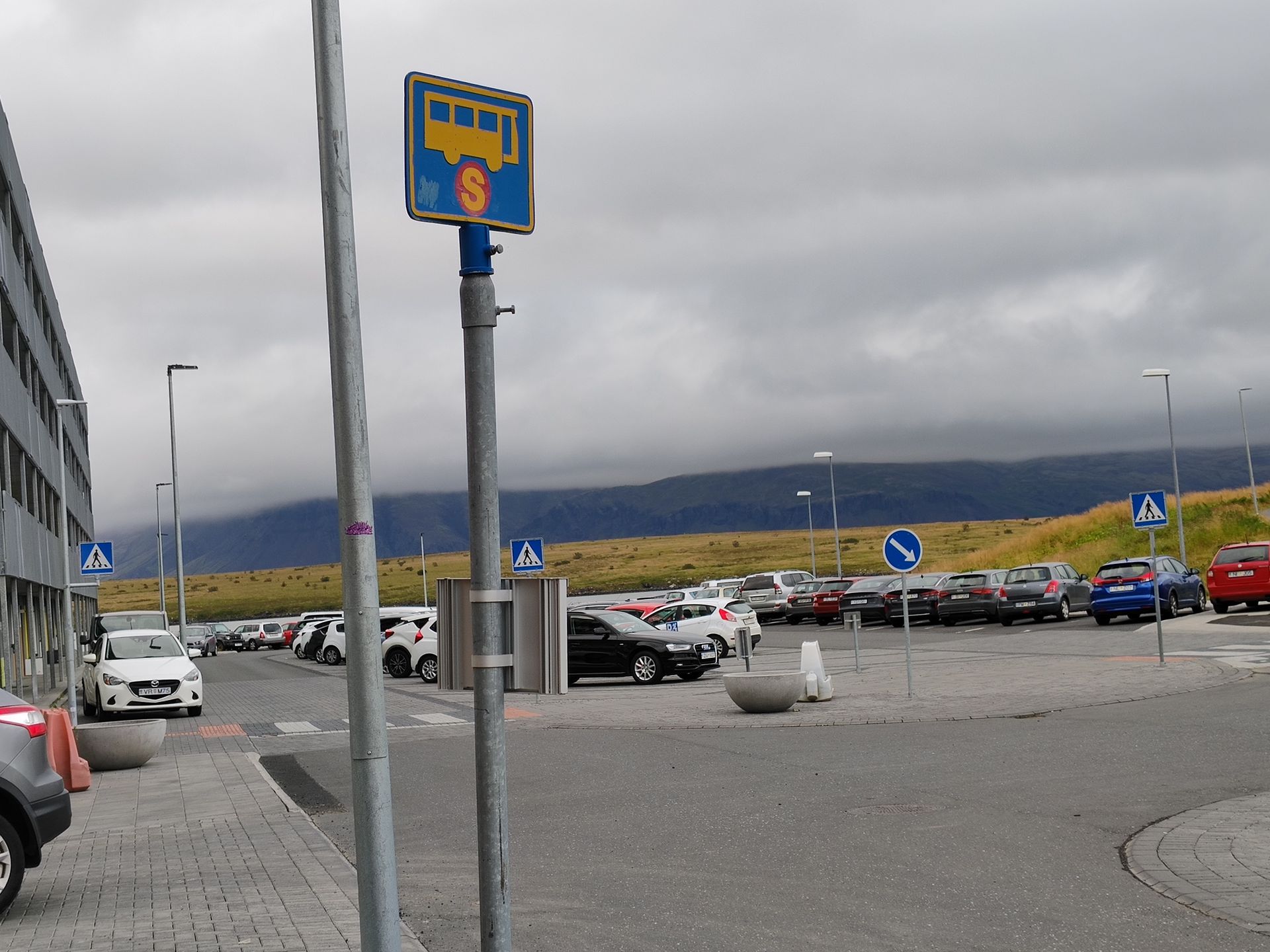 Merki Strætó við Jöfursbás 11. Fallegur gulur vagn á skiltinu. Málið er hins vegar að það koma engir vagnar í hverfið heldur er ennþá pöntunarþjónusta leigubíla.