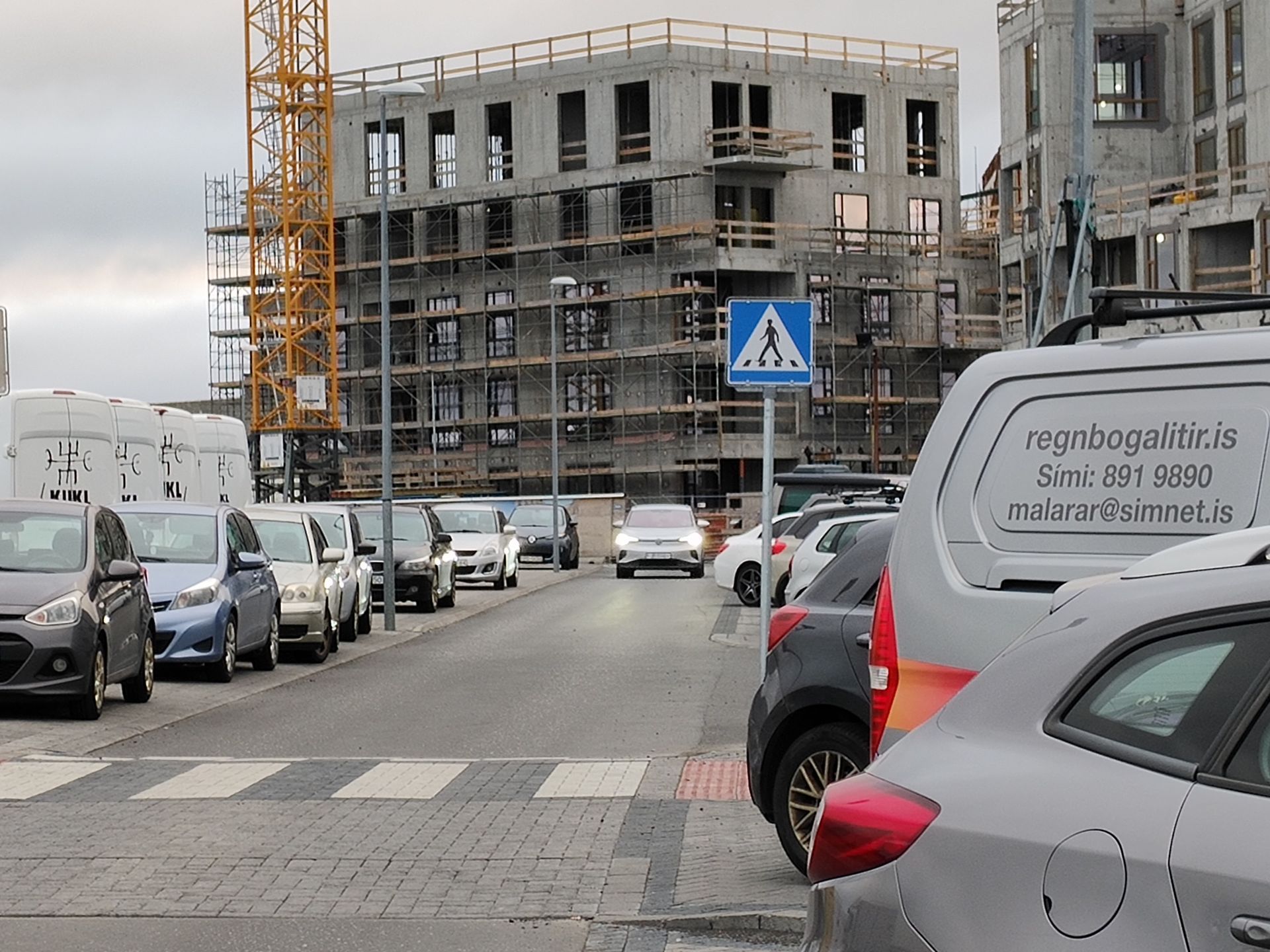 Lagt ólöglega uppi á gangstétt í Gufunesi. Íbúarnir segja lögreglu og stöðumælaverði koma reglulega til að sekta bíleigendur fyrir að leggja uppi á gangstéttum. Eftir klukkan átta á kvöldin er nánast útilokað að fá stæði - líka á malarstæðinu sem er lengst til hægri á myndinni.