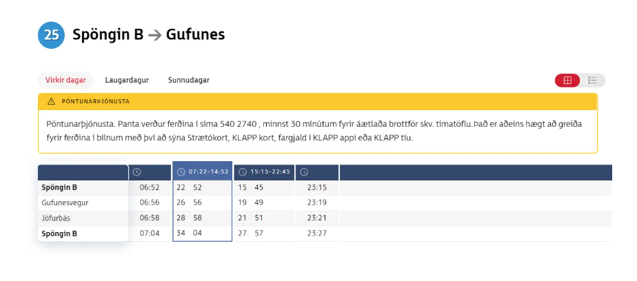 Í sumar auglýsti Strætó aukna þjónustu á leið 25 í Gufunesið. Hún fólst í því að frá og með 1. júlí yrði leiðin með 30 mínútna tíðni á virkum dögum í stað um 60-120 mínútna tíðni. Í praxís þýðir þetta að leigubíll kemur fyrstu þrjár ferðirnar á morgnanna skv. þessari tímatöflu og þrisvar síðdegis. Annars gildir það að hringja í Strætó með 30 mínútna fyrirvara og panta leigubíl - sem ekur þá viðkomandi upp í Spöng.
