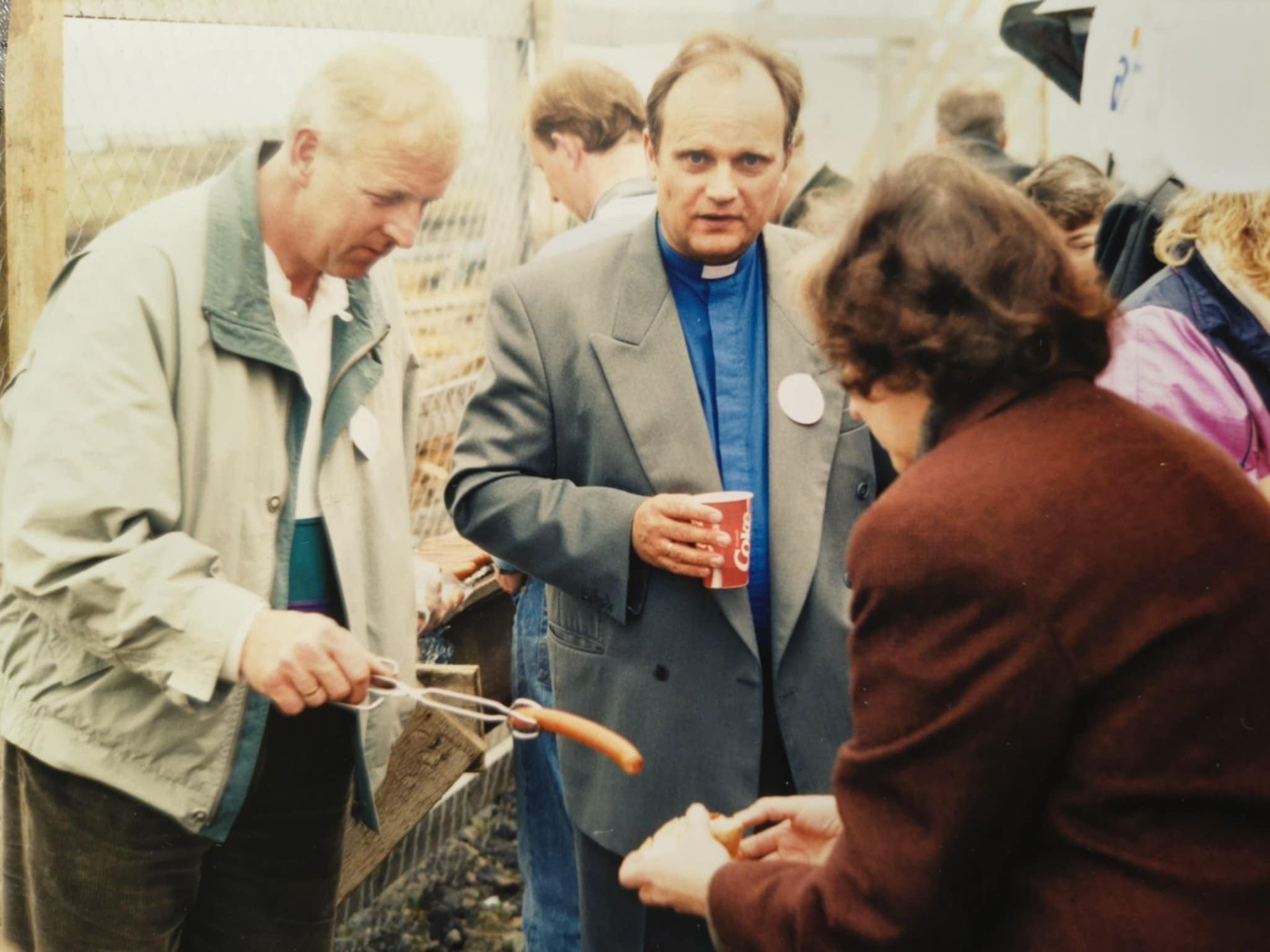 Vorið 1992 þar sem pylsur voru grillaðar í lok barnastarfsins þá önnina. Ingjaldur Eiðsson, einn af máttarstólpunum í sókninni á byggingartímanum, stóð sína plikt við grillið. Með honum eru hjónin séra Vigfús Þór Árnason og Elín Pálsdóttir.