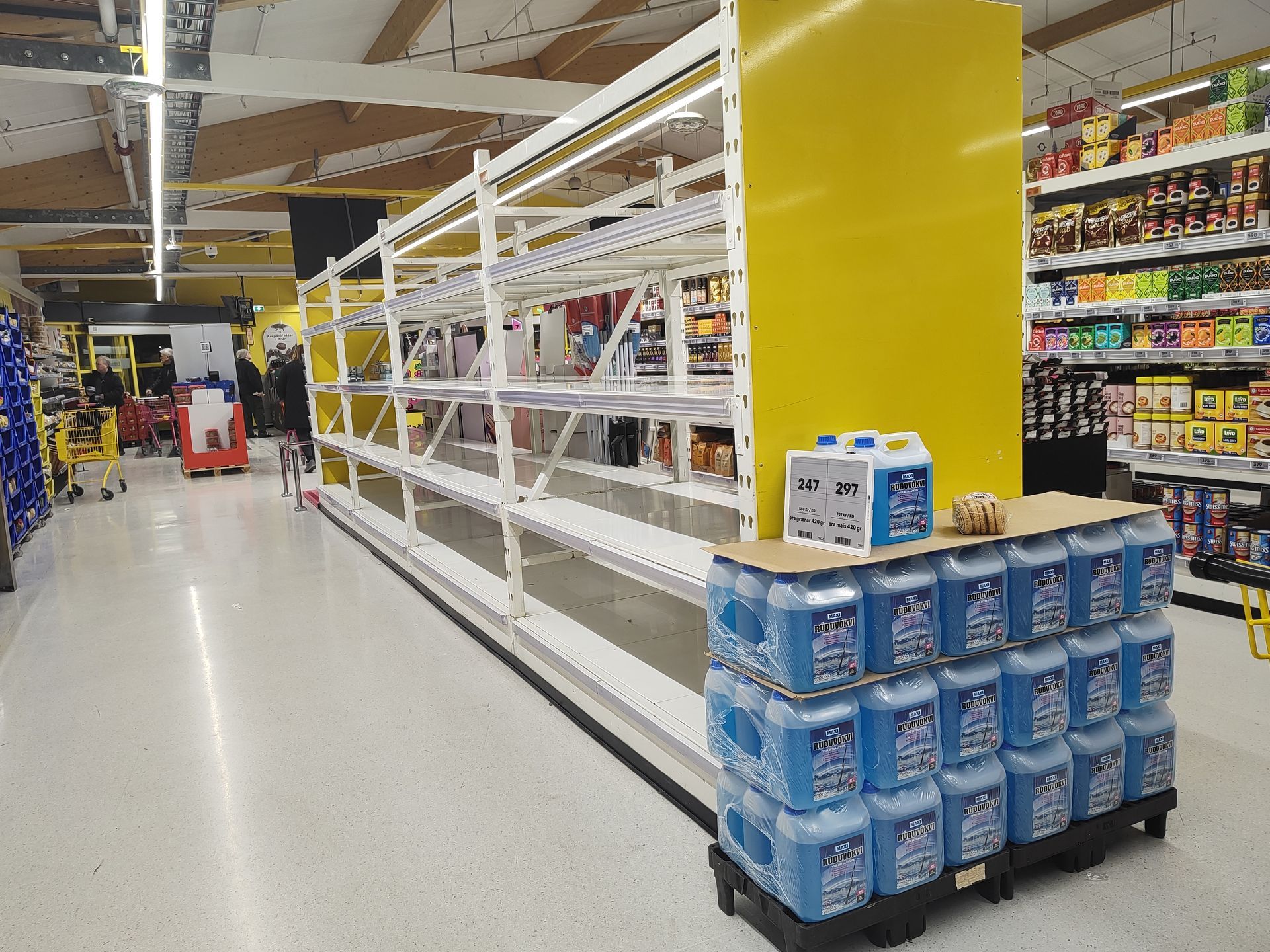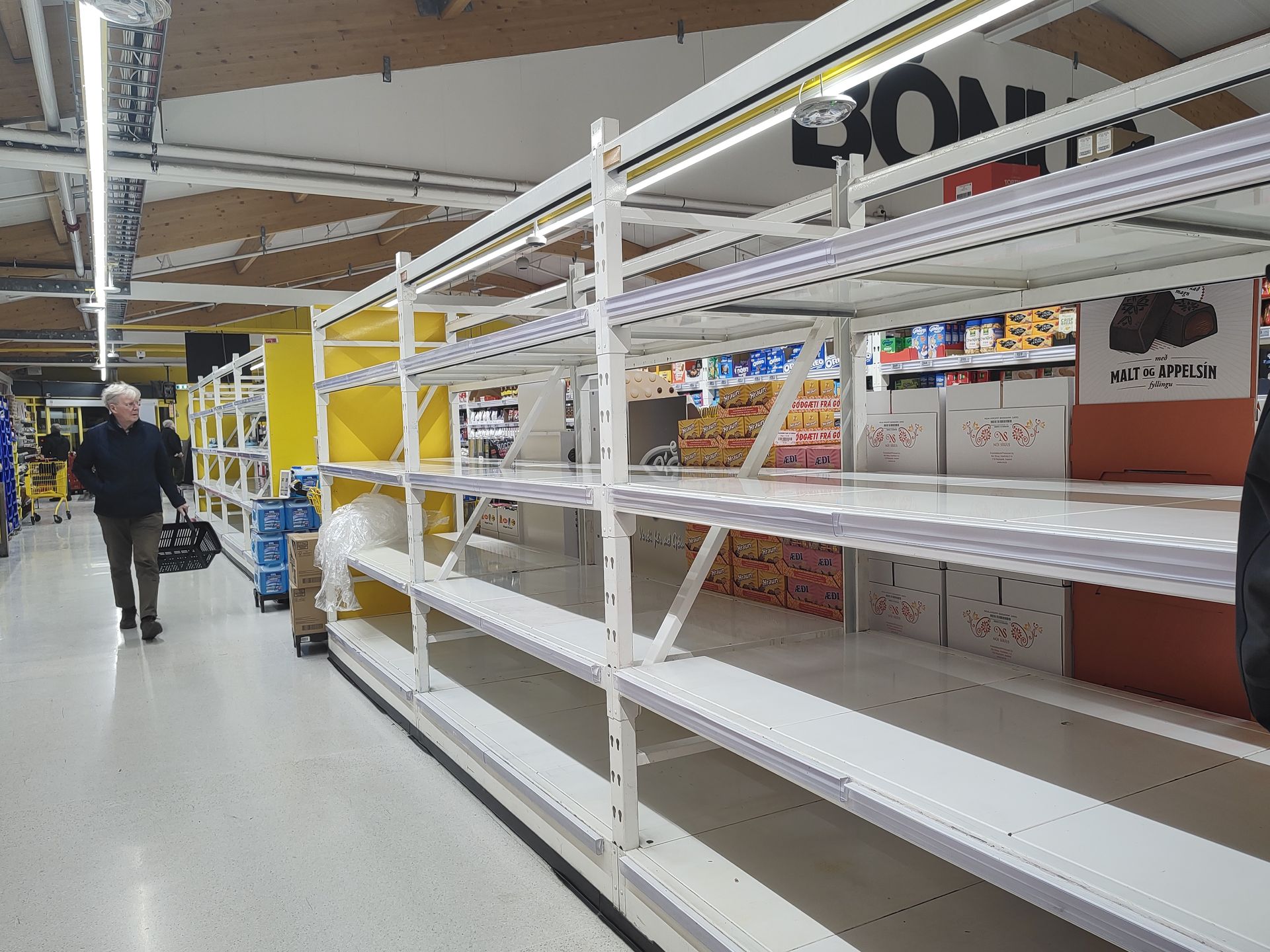 Það var ljóst í gær að eitthvað bjó að baki tómum hillum annað en vöruskortur. Jú, það var verið að fækka um einn rekka í búðinni og lengja hina til að koma vörunum fyrir.