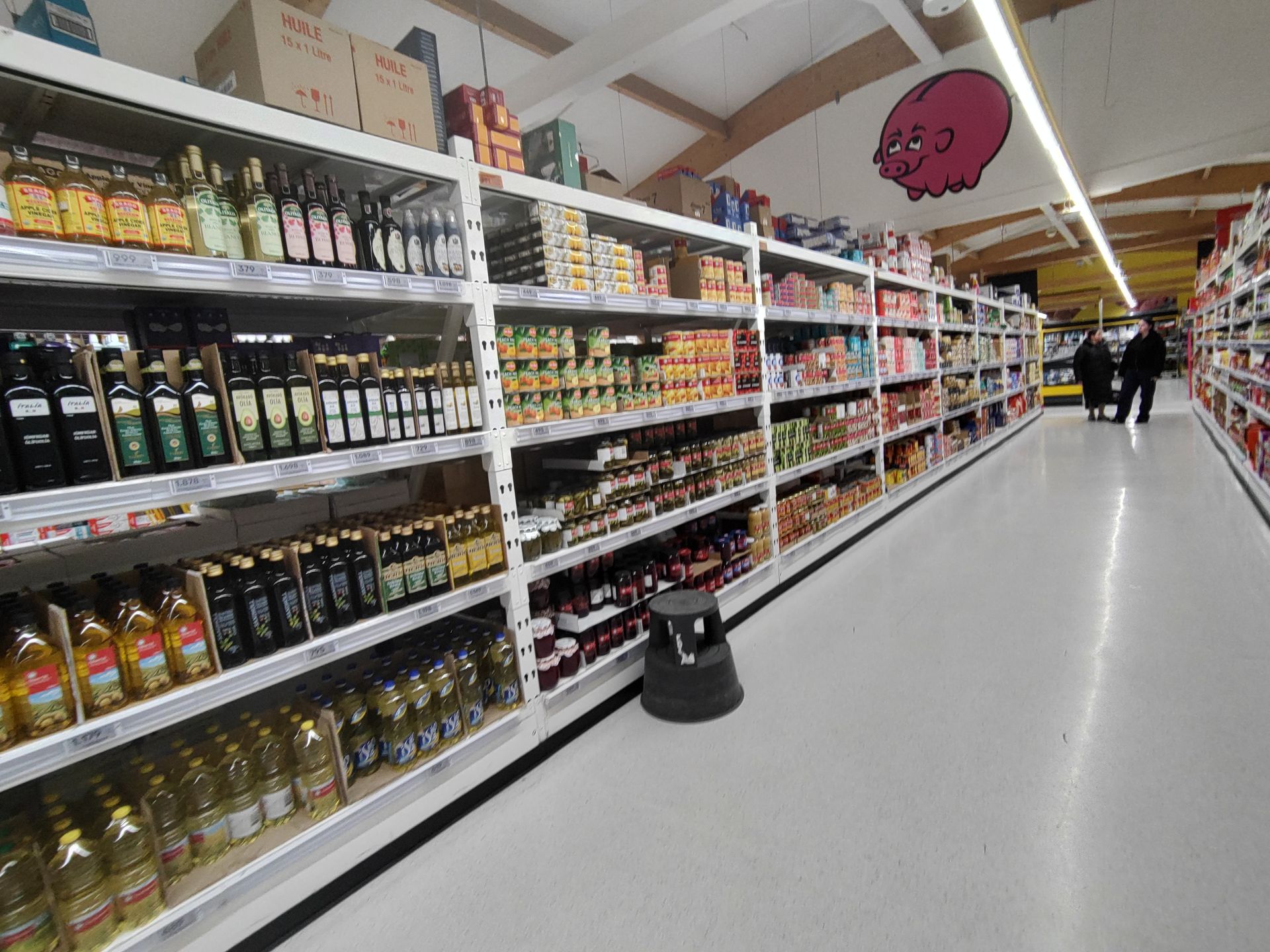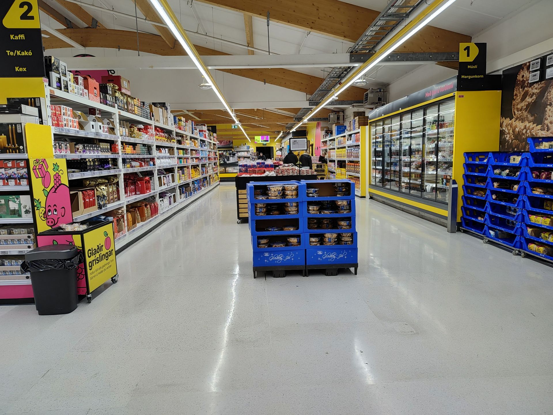 Gangurinn þvert á rekkana þegar inn í búðina var komið hefur augljóslega tekið meira rými en maður gerði sér grein fyrir. Nú er hann horfinn og búið að lengja og strekkja á hinum til að koma vörunum fyrir.
