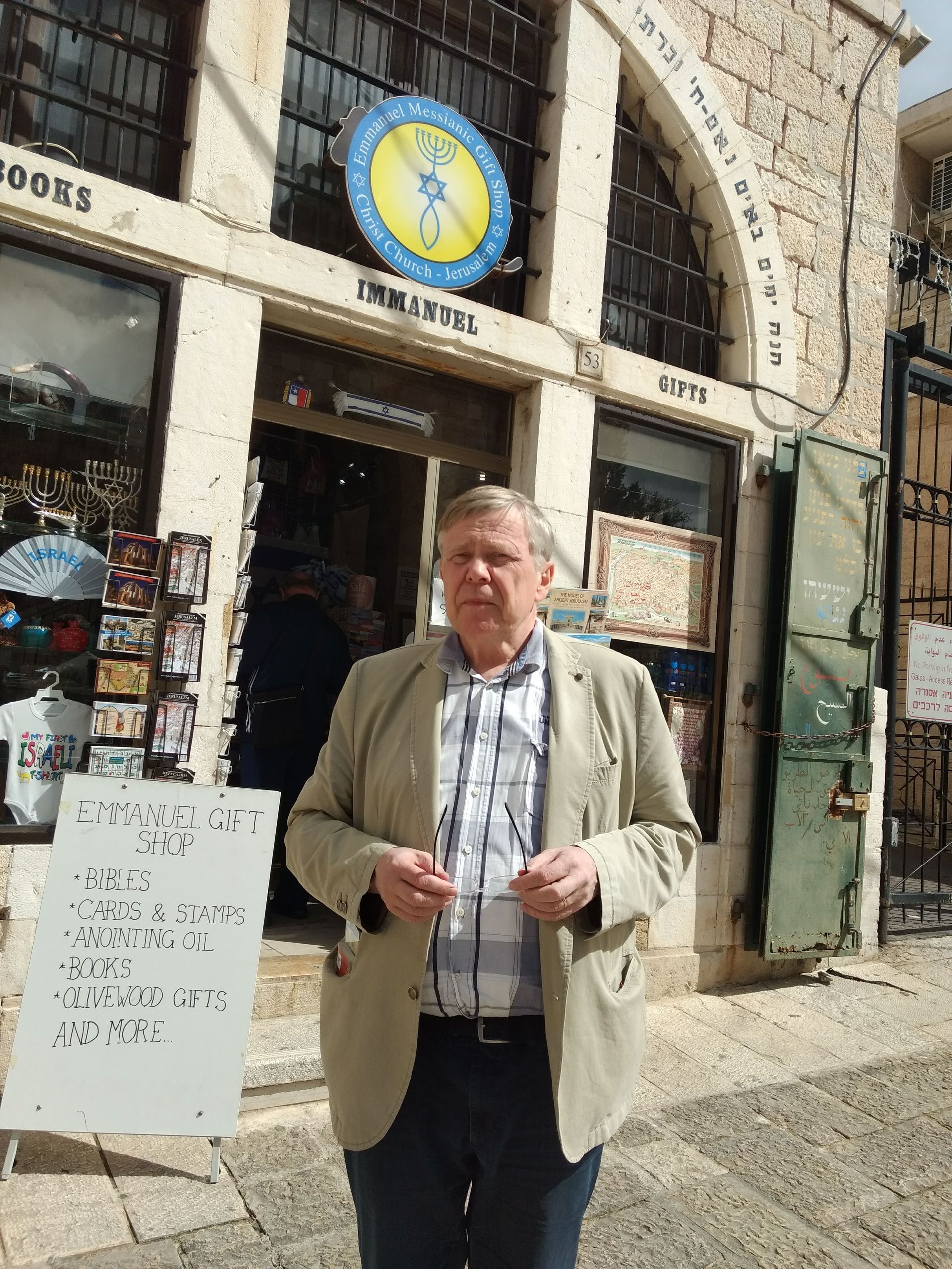 Gunnlaugur A. Jónsson, fyrrum prófessor i guðfræði við Háskóla Íslands, fyrir utan þekkta bóka- og gjafavöruverslun sem er gegnt Davíðssafninu í Jerúsalem.