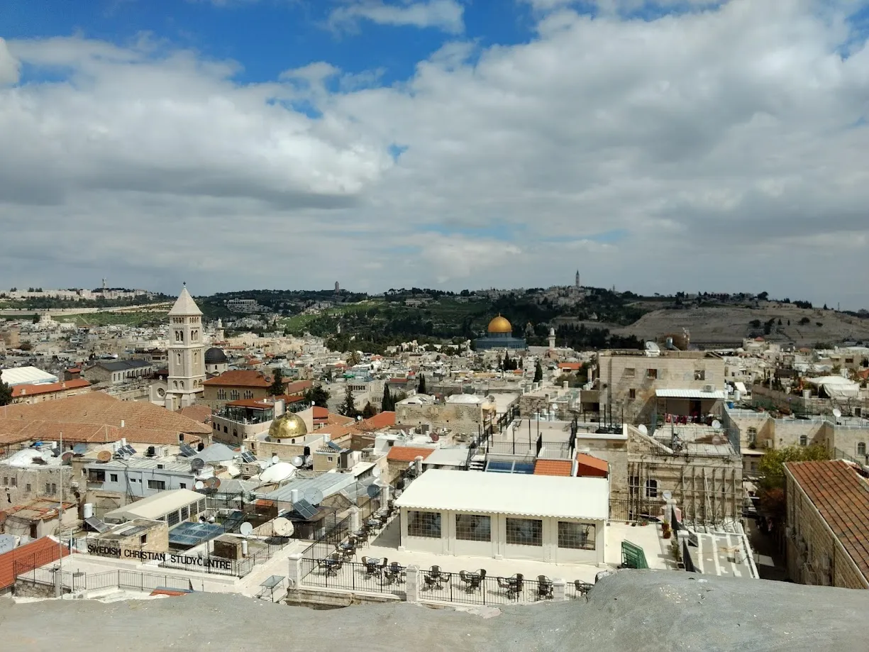 Hér er horft í átt í Ólífufjallsins af efstu hæð Davíðssafnsins. Moskan með gyllta þakinu fyrir miðri mynd er Musterishæðin eða Al Aksa moskann sem er moska múslima innan gömlu borgarmúranna í Jerúsalem og undir stjórn múslima. Al Aksa þýðir „fjarlægur staður“ og vísar til landfræðilegrar staðsetningar langt frá Mekka. Iðulega er vísað til Al Aksa sem þriðja helgasta stað Íslam, á eftir Mekka og Medína.