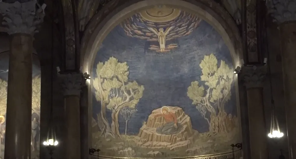 Við hliðina á Gethsemane-garðinum er afar falleg kirkja sem ýmist er nefnd Kirkja allra þjóða eða Kirkja angistarinnar. Hér er altaristaflan í þeirri mögnuðu kirkju.
