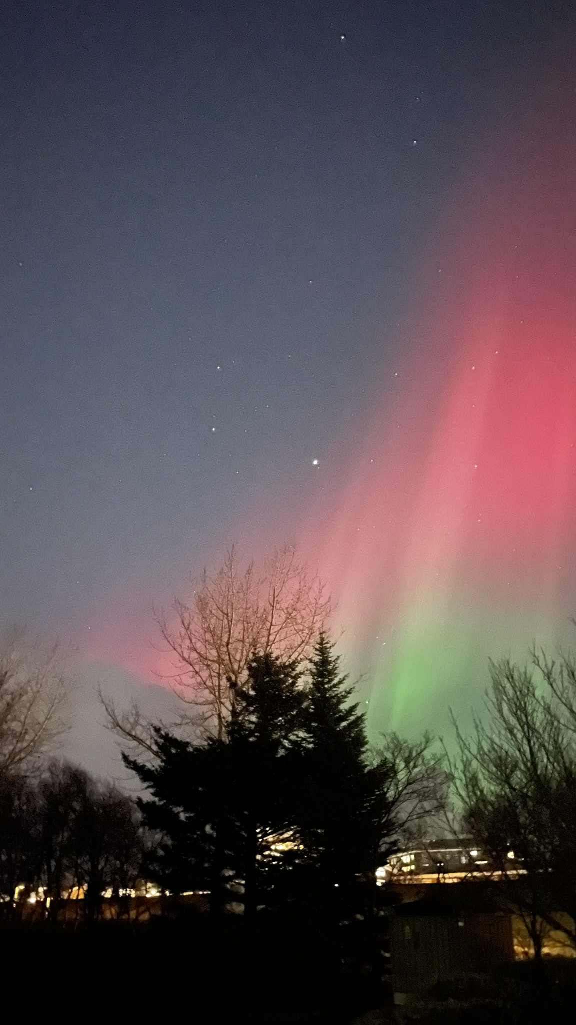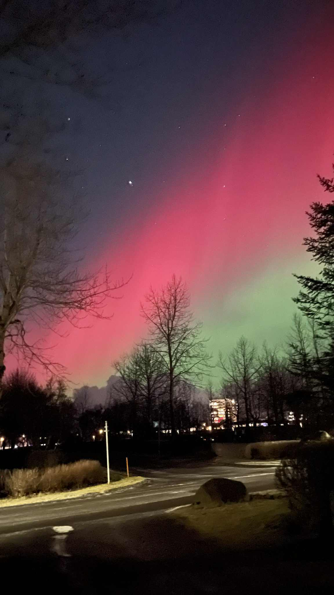 Það er ekki oft sem rauði liturinn er svona sterkur og tekur vel á móti þeim græna. Þetta er alvöru ljósasjó í Grafarvoginum í kvöld. (Ljósmynd: Guðrún Ólafsdóttir)