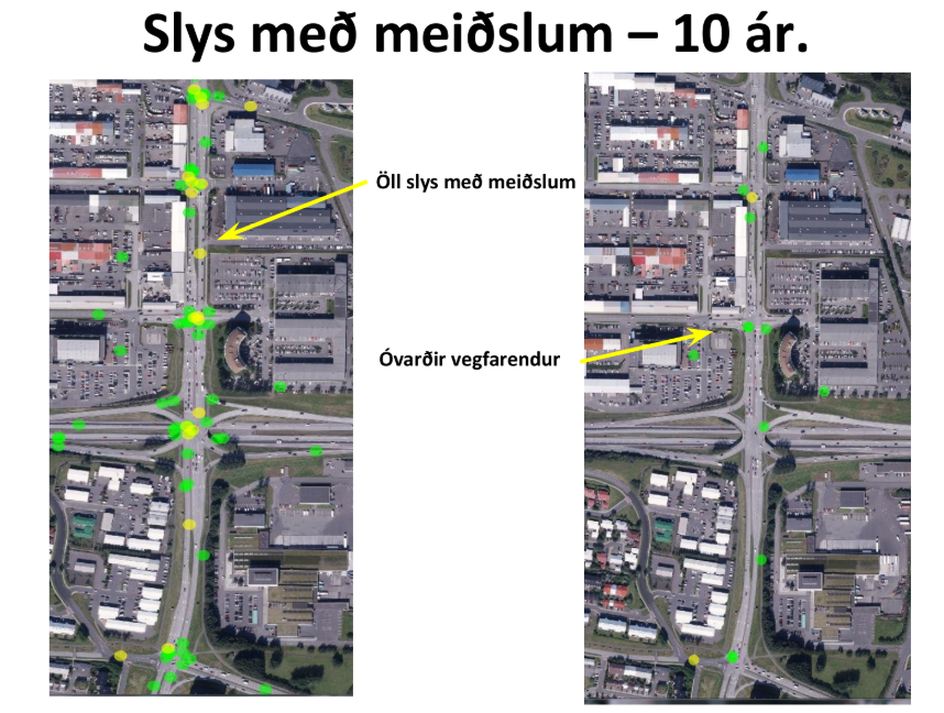 Ekkert þessara slysa á gangandi og hjólandi má rekja til þeirra umferðareyja sem nú hafa verið stækkaðar eða þeirra beygjuvasa sem hafa verið lagðir af. - JGH