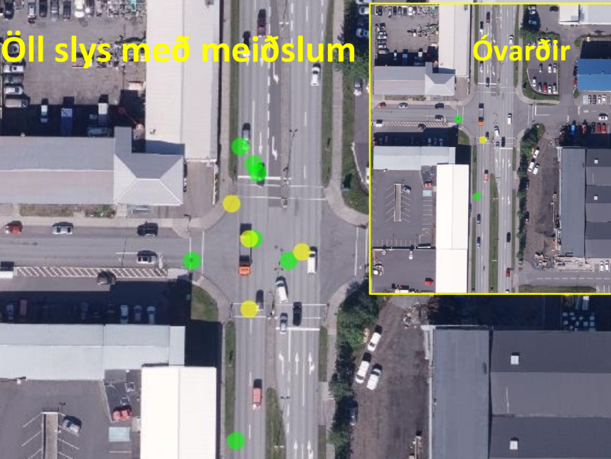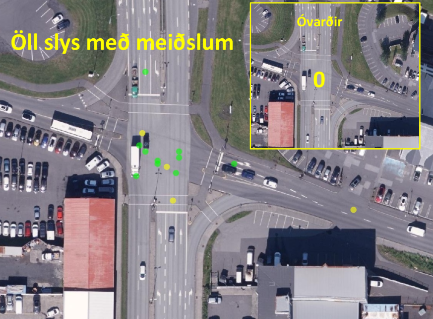 2) Græni punkturinn (lítil meiðsl) til hægri inni á bílaplani. Ekið á fótg. á bílaplaninu og því utan akbrautar.