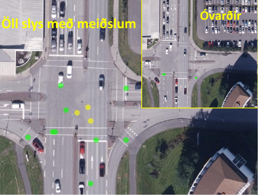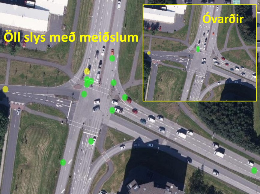 1) Græni punkturinn (lítil meiðsl) til vinstri. Ekið á hjólreiðamann á gangbraut á ljósum. (Annar hvor fór yfir á rauðu).