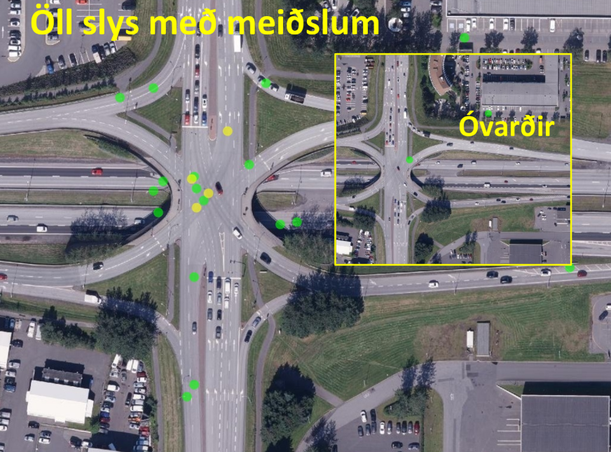 1) Guli punkturinn (Alvarlegt slys). Lengst til vinstri. Ekið á hjólreiðamann á akbraut; ath. ekki gangbraut og ekki við gatnamótin.