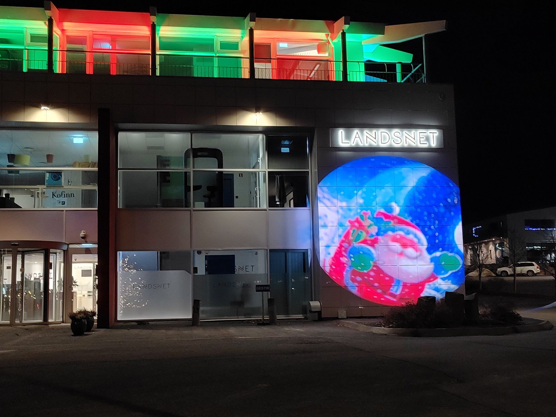 Sveinninn rauði ekki upp við vegg heldur varpað upp á vegg hjá vel skreyttu Landsneti. Nóg rafmagn þar.