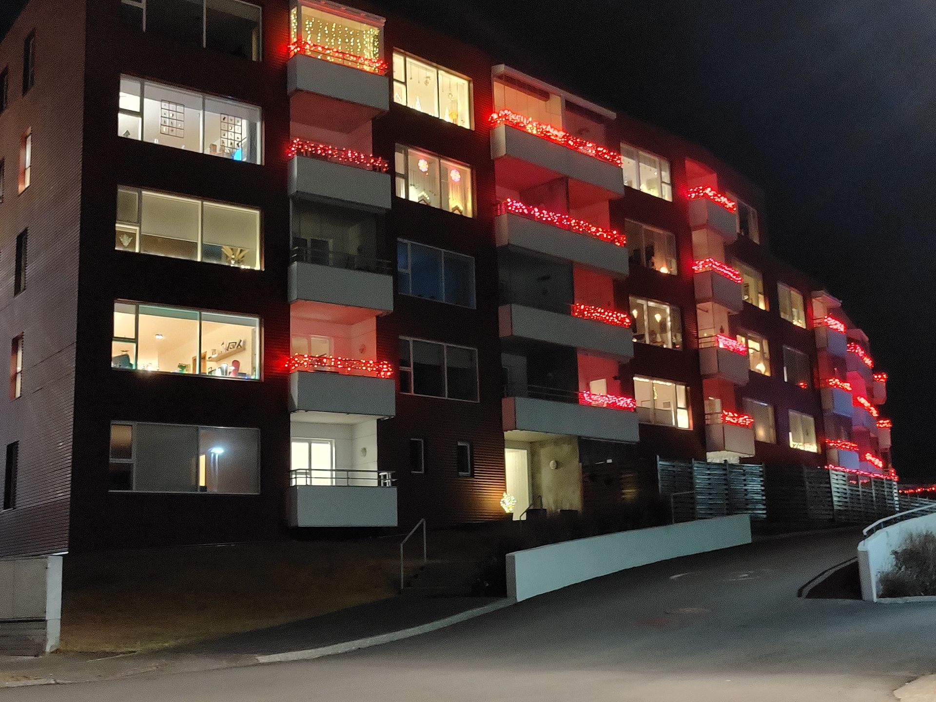 Samræmi. Þetta smekklega fjölbýlishús við Sóleyjarima tekur sig vel út. Þyrfti kannski að setja seríur á allar svalir til að taka þetta alla leið.
