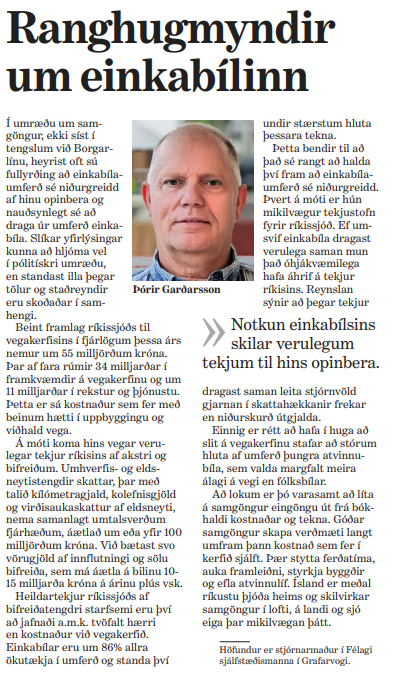 Þórir segir í grein sinni: „Umhverfis- og eldsneytistengdir skattar, þar með talið kílómetragjald, kolefnisgjöld og virðisaukaskattur af eldsneyti, nema samanlagt umtalsverðum fjárhæðum, áætlað um eða yfir 100 milljörðum króna. Við bætast svo vörugjöld af innflutningi og sölu bifreiða, sem má áætla á bilinu 10-15 milljarða króna á árinu plús vsk. Heildartekjur ríkissjóðs af bifreiðatengdri starfsemi eru því að jafnaði a.m.k. tvöfalt hærri en kostnaður við vegakerfið.
