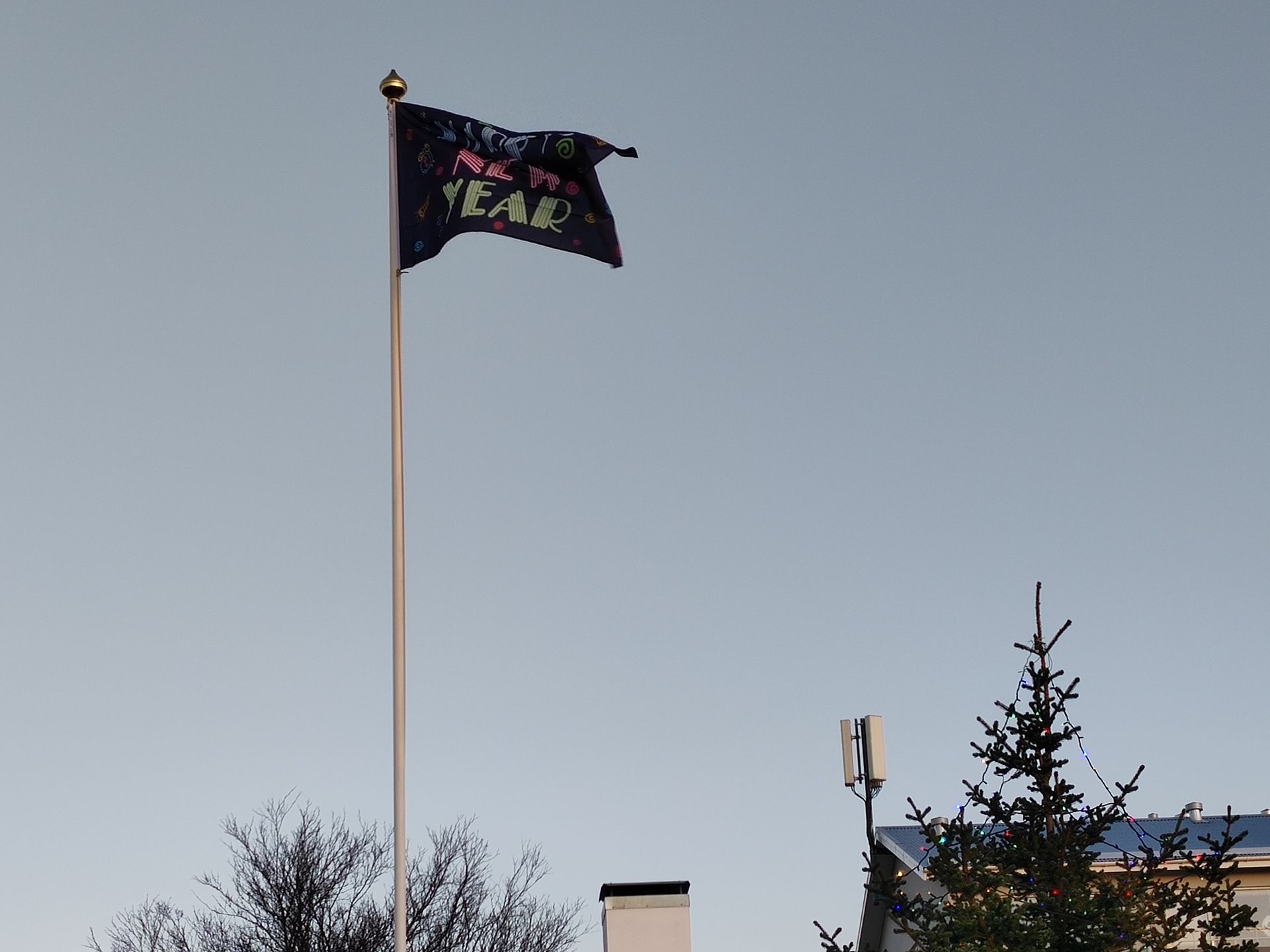 Og síðasti fáni ársins hjá honum var auðvitað; Happy new year. Gleðilegt ár.