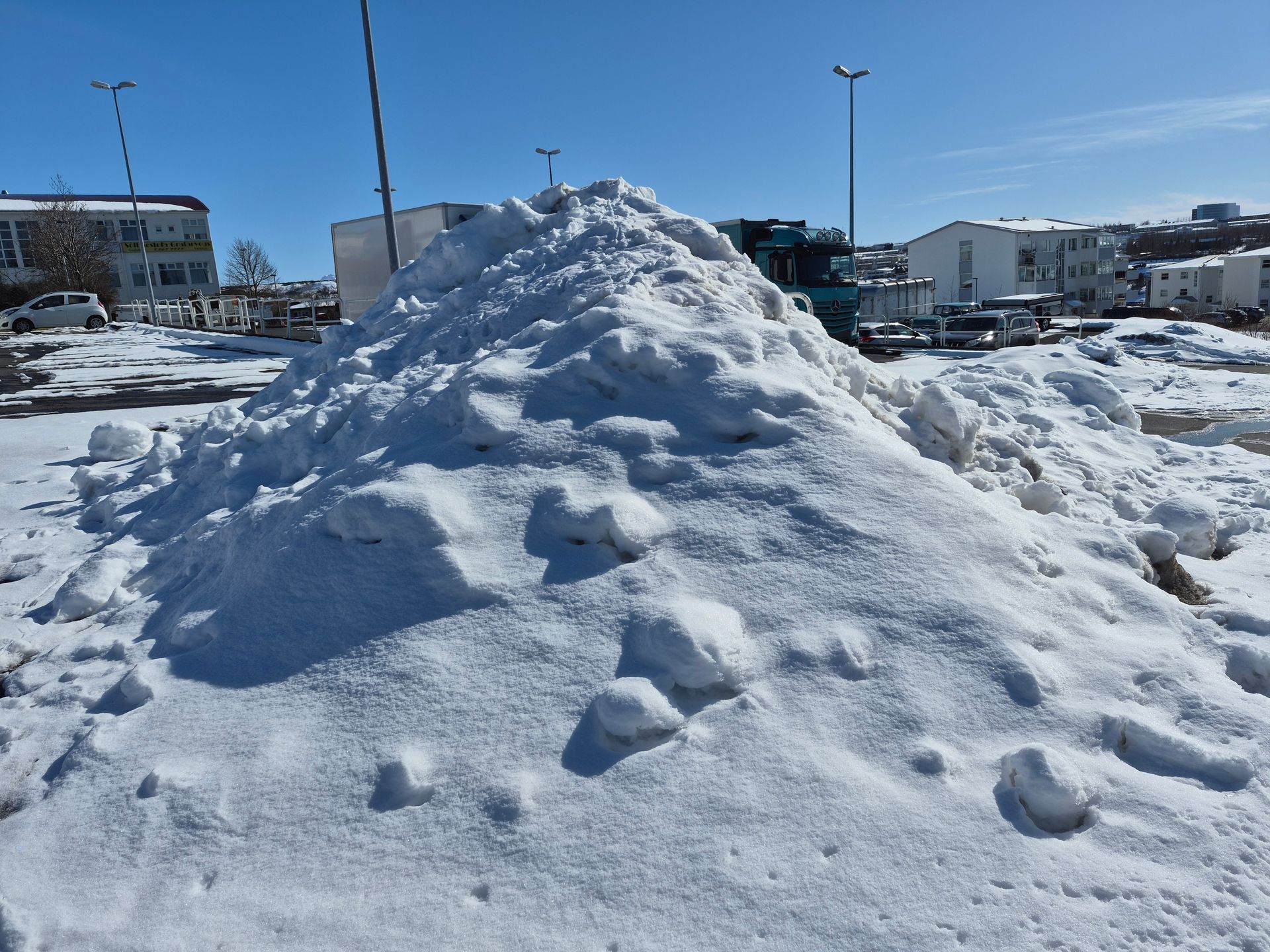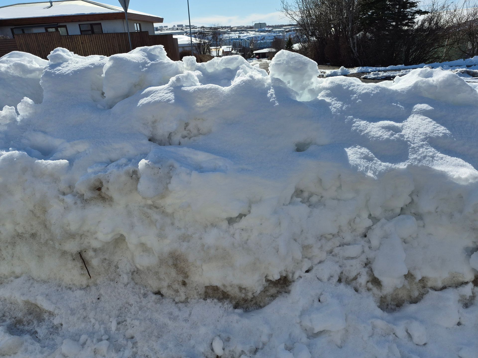 Upphafsmyndin er tekin í Hamrahverfinu, Lokinhömrunum, með þriggja sólarhringa millibili. Búið að moka upp góðum skafli og útlit væri fyrir að ætti langt í land með að hverfa. Myndin í hringnum er tekin eftir hádegi í dag og skaflinn ekki svipur hjá sjón.