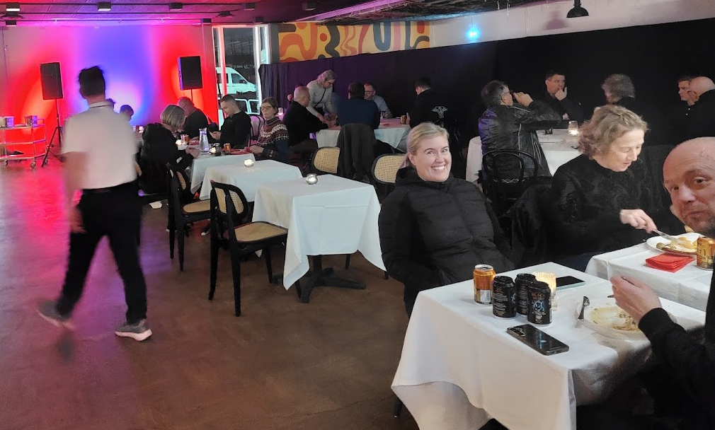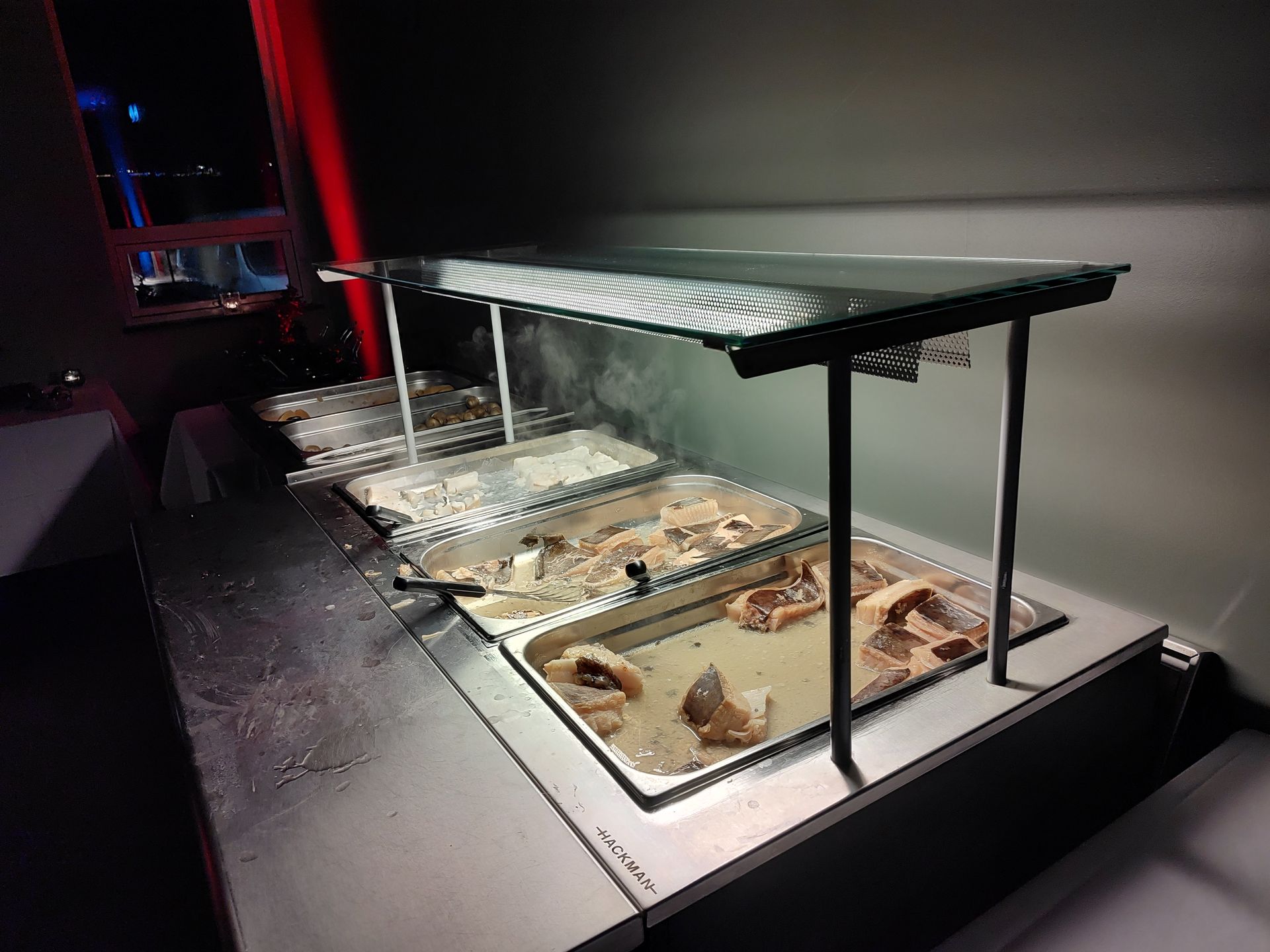 Séð yfir hluta salarins og rammíslensk hátíðarfæða á borðum; kæst skata.