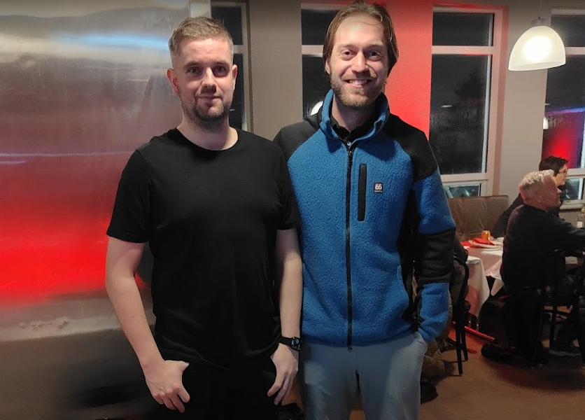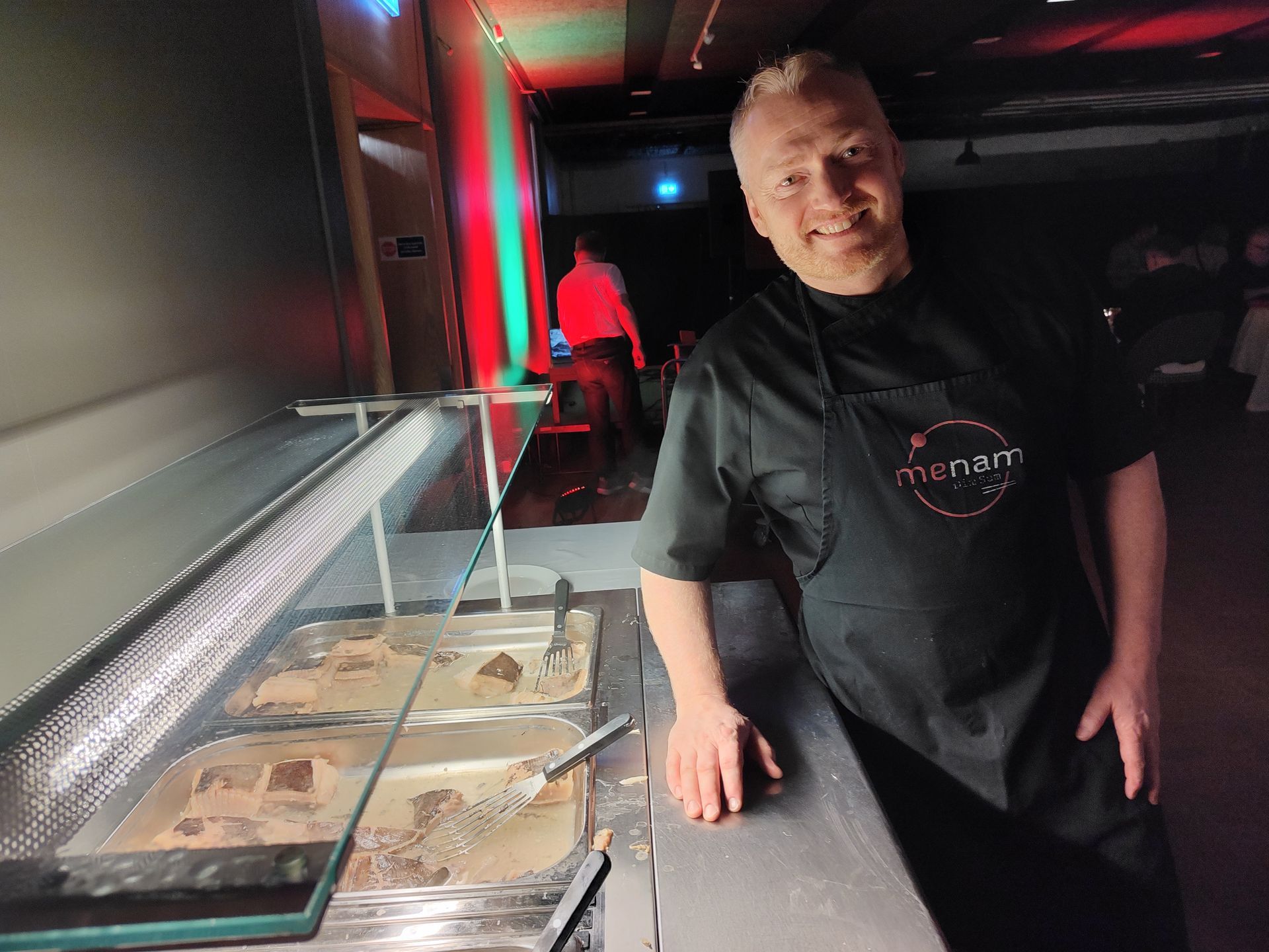 Fjölnismenn höfðu samband við okkur og við vorum á báðum áttum enda ekki alveg tilbúnir. En það var ákveðið að kýla á þetta. Fjölnismenn komu með hráefnið til okkar í dag, vel kæsta skötu, kveikt var undir pottunum, flikkað upp á salinn til bráðabirgða og allt sett í gang. Fyrstu gestirnir mættu klukkan átján og þetta hefur heppnast mjög vel. Allir ánægðir og í jólaskapi. Fyrsta veislan, fyrsta „giggið“ hjá okkur en samt allt ekki tilbúið - er þetta ekki bara íslenska leiðin sem hefur gagnast oft svo vel?,“ segja þessir hressu kokkar.